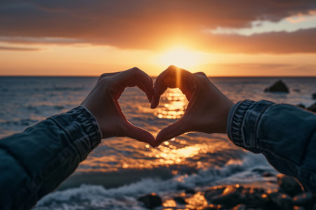 Two hands forming a heart in the ocean at sunset. Concept of love and warmth, as the sun sets in the background, casting a beautiful glow on the water. The scene captures a moment of connection