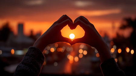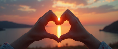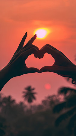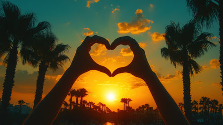 Two hands create a heart shape silhouetted against a setting sun. The image features warm tones of orange and red, with the sun's bright light casting a glow. The composition showcases a tropical outdoor scene. Suitable for love, relationship, and romantic themed content, offering diverse visual applications.