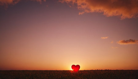 Silhouetted hands exchanging a glittering red heart, symbolizing love and connection during sunset