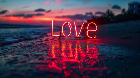 A glowing neon sign spelling love shines on a sandy beach at sunset, casting reflections in the wet sand as waves roll in