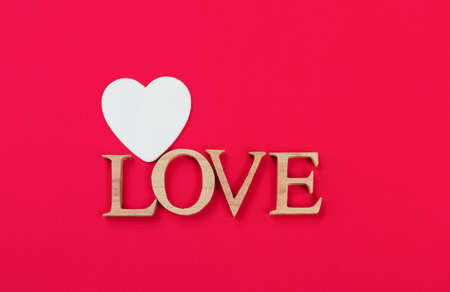 Valentine day love concept. Word love made from wooden letters on red paper background