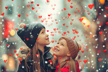 A joyful couple shares an intimate moment outdoors, surrounded by heart-shaped confetti, embodying love and happiness in a festive atmosphere.