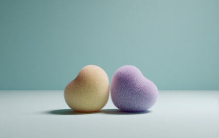 Two heart-shaped objects, one pastel yellow and the other pastel purple, are positioned side by side on a light blue surface. The image features soft lighting and a minimalist style. The smooth texture of the objects contrasts with the textured background. It could be used for various projects.