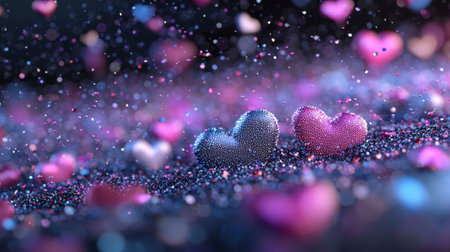 A close up of two hearts on a dark background. The hearts are surrounded by glitter and are the only objects visible in the image. Scene is romantic and dreamy, as the glitter