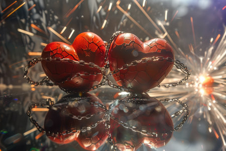 Radiant Glowing Red Hearts Connected by a Chain on a Beautiful Reflective Surface