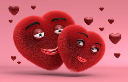 Romantic illustration with loving characters - fur hearts. Valentines Day Valentine. 3D Render