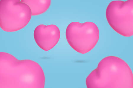 Creative idea with floating hearts in the air on pastel blue background. Minimal symbol of love for Happy Women's, Mother's, Valentine's Day, birthday greeting card design