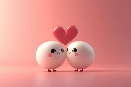 Two cute cartoon characters share a tender moment with a heart. The vibrant pink background enhances the playful and romantic theme, ideal for various designs.