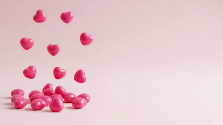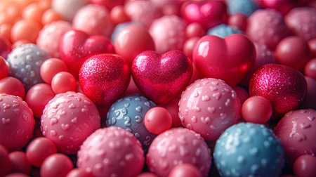 A bunch of colorful hearts are scattered around in a pattern. The hearts are of different sizes and colors, creating a vibrant and lively atmosphere. Concept of joy and celebration
