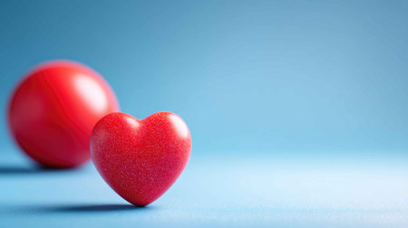 A vibrant red heart figurine and a round ball rest on a smooth blue surface, creating a cheerful and romantic atmosphere perfect for various themes and celebrations.