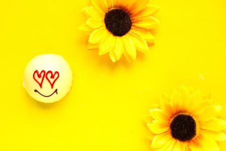 Tasty sweet cake with draw face and heart eyes on yellow background, top view. Love concept.
