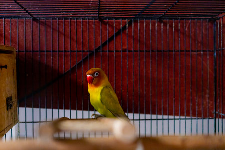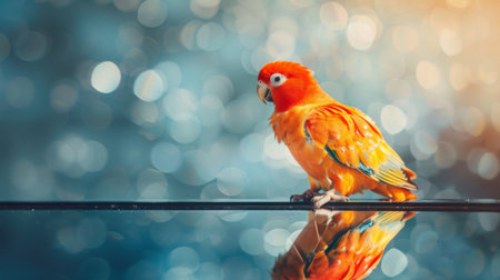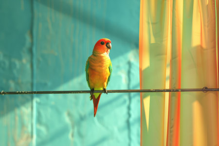A vibrant lovebird sits gracefully on a windowsill, showcasing its stunning green and orange feathers. The captivating expression adds charm to any indoor space.