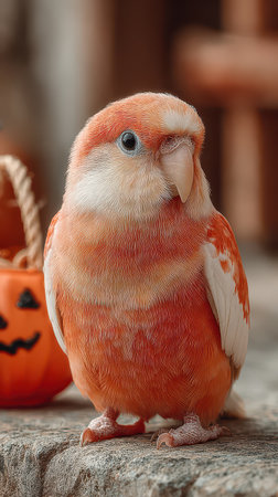 A vibrant orange bird stands next to a small Halloween pumpkin. The bird appears curious and lively in a natural setting.