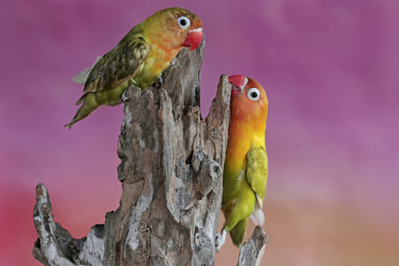 lovebirds are perched on a tree branch. This bird which is used as a symbol of true love has the scientific name Agapornis fischeri, domestic birds