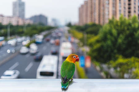 Budgerigar bird is stopping by the bridge on the highway. With the natural beauty of the colors of green feathers, yellow, orange, red and blue.