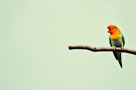Colorful rosy faced lovebird perched on a bare branch against a serene pastel green backdrop, creating a simple yet captivating image
