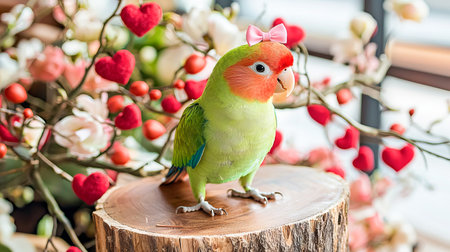 Cheerful Parrot with Pink Bow Perched on Tree Stump Amid Heart and Flower Decorations. Concept of Joyful Animals, Nature's Beauty, Colorful Wildlife, Festive Decor. Valentine's Day.