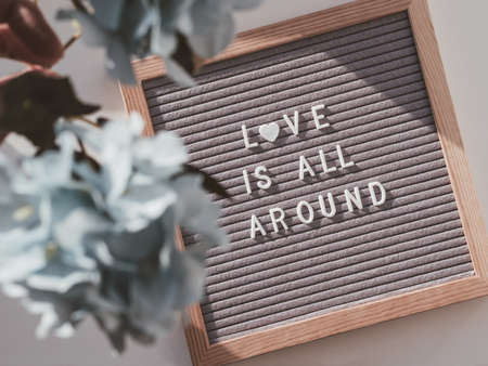 Top view on letter board with words LOVE IS ALL AROUND. Flat lay concept heart symbol of love and romance. Blue hydrangea flowers upon background with sunlight and shadow.