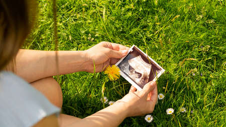 Ultrasound photo pregnancy baby. Woman holding ultrasound pregnant picture on grass flower background. Concept maternity, pregnancy, childbirt