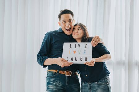 Happy Asian couple laughing and having fun togerther in room while holding live, love, laugh sign. Valentine concept
