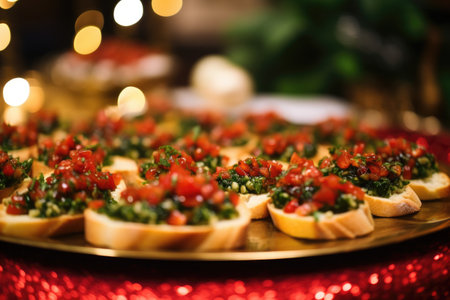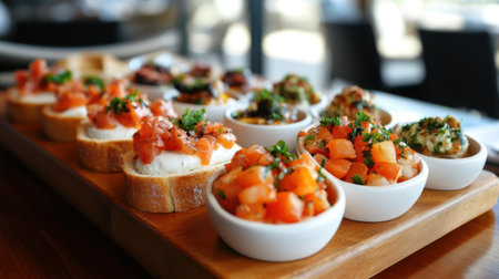 A delightful array of bruschetta featuring vibrant tomatoes and herbs on toasted bread, perfect for events or gatherings. A feast for the senses showcasing colorful ingredients.