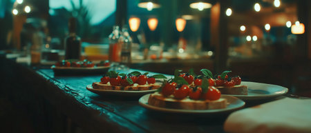 A vibrant spread of appetizers showcases fresh tomato-topped toasts with herbs on a wooden platter, perfect for sharing in a chic restaurant setting.