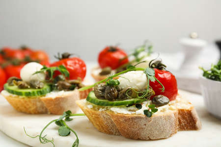 Tasty bruschettas with capers, vegetables and mozzarella served on white marble board, closeup