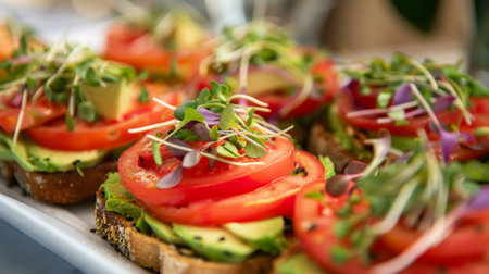 A colorful array of open-faced sandwiches topped with avocado, tomato, and microgreens, arranged on a platter for a light and refreshing meal