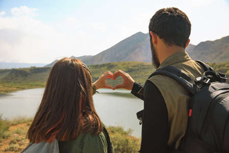 The views of the snowy peaks and the river valley at dawn. Journey through the hill country. Tourist attractions, natural beauty.