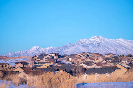 Brown houses in a town in Utah valley winter landscape with snow on the ground and mountain in background