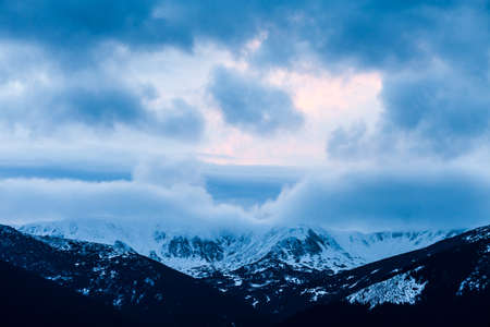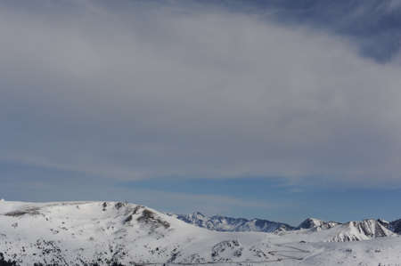 Pyrenees mountains range in winter with snowy peaks in Grandvalira ski paradise resort in Andorra