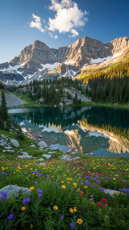 Vibrant showing a panoramic view of a serene alpine lake reflecting snow-capped mountains and a dense evergreen forest under a clear blue sky with fluffy white...