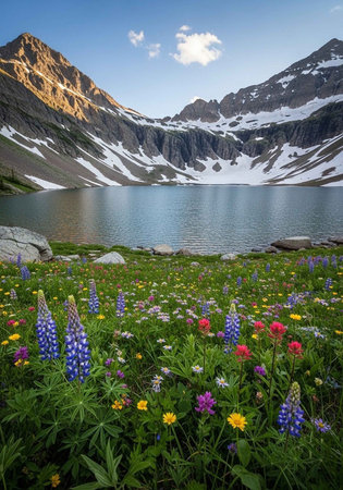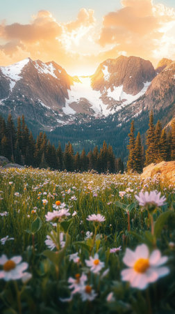 As the sun sets behind the majestic Rocky Mountains, vibrant wildflowers bloom in a lush meadow, showing nature's beauty and tranquility in the evening light.