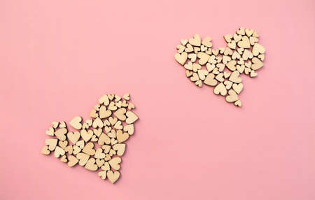 Wooden hearts on pastel pink background. Holiday banner, web poster, flyer, greeting card, cover. Romantic background