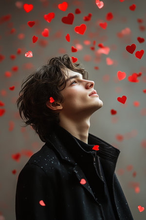 Heart-shaped confetti creates a romantic atmosphere against a dark backdrop