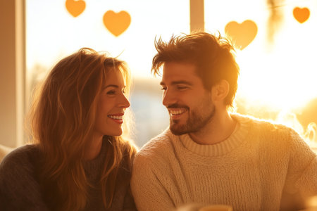 Couple enjoying sunset glow in cozy cafe with heart decorations