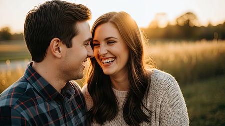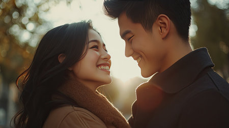 A smiling couple is shown close together outdoors. The composition features a shallow depth of field, with soft sunlight creating a warm glow. The image has a natural, candid feel, with focus on connection and affection. Potential uses include editorial illustrations or imagery related to relationships and lifestyle themes.