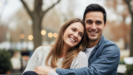 A smiling couple is depicted embracing and looking towards the viewer in this medium shot. The image displays natural light and blurred background, suggesting an outdoor setting. The individuals exhibit expressions of joy. This image could be suitable for visual content related to relationships, lifestyle, or marketing materials.