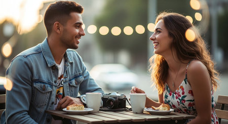 A young couple enjoying coffee and conversation at a cozy cafe