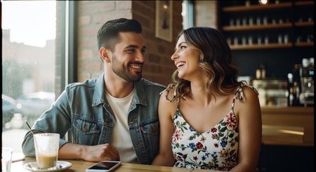 A young couple shares joyful laughter while sitting close in a warm, inviting cafe. Outside, daylight streams through the window, highlighting their happiness.