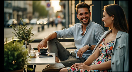 A smiling man and woman sit at a small table outside a cafe, with a cup of coffee and plants nearby, on a blurred city street background.