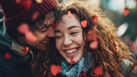 A joyful couple shares an intimate moment outdoors, surrounded by heart-shaped confetti, embodying love and happiness in a festive atmosphere.