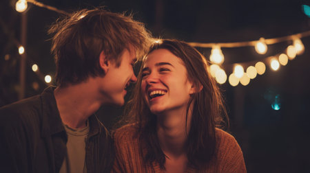 A romantic young couple shares a joyful moment under soft fairy lights during a cozy evening. Their laughter and playful expressions create a heartwarming atmosphere of love and connection.