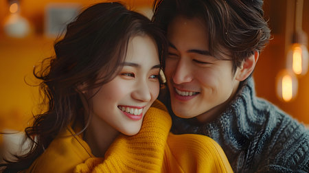 An intimate moment as an Asian couple holds each other, the man smiling warmly at his fiancae, expressing trust and care