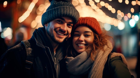 Smiling young couple at night under festive holiday lights