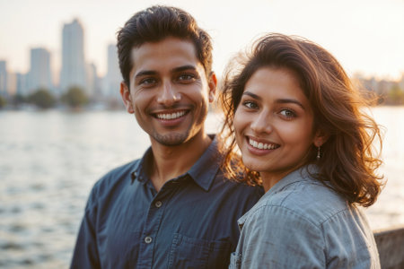 Portrait of Indian happy couple enjoying view on city embankment at sunset