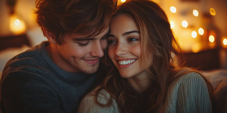 A couple enjoys a tender moment with smiles in a warmly lit, intimate setting.