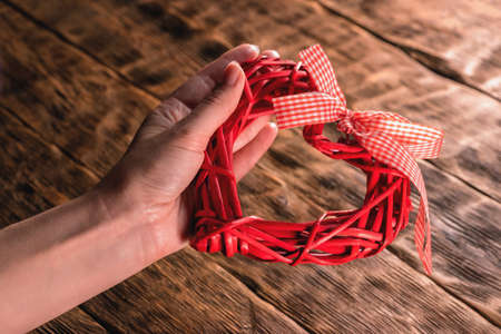 Female hand is holding a red heart gift on the brown wooden table background.
