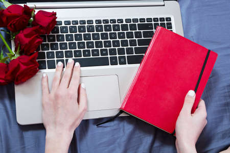 Work space at home, keyboard top view, female hand close up, notebook, work space on bed top view, flowers, colour background
