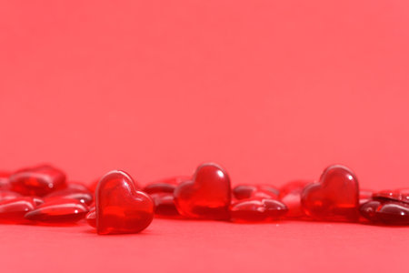 A vibrant and festive arrangement of red and pink heart-shaped candies scattered on a teal background, perfect for Valentine's Day or love-themed celebrations.